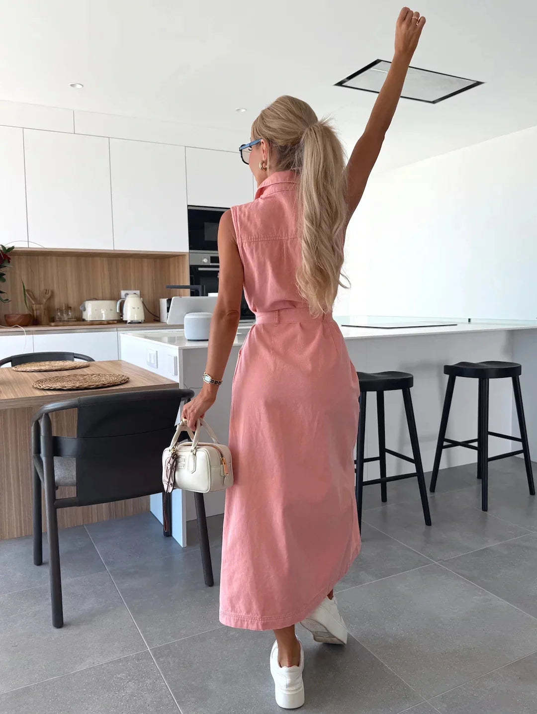 Louisa | Maxi Denim-kjole er den perfekte blandingen av avslappet komfort og stilig stil. Den er laget av et mykt, pustende denimstoff og designet i en ermeløs, løstsittende modell med gjennomgående knappelukking og subtile, lekne detaljer. Denne kjolen passer til alle anledninger, fra en avslappet dag med joggesko til en middag med høye hæler og tilbehør. Louisa er tidløs, komfortabel og alltid riktig - en favoritt du kommer til å bruke hele sesongen. Vi har dette must-have i 2 farger til!